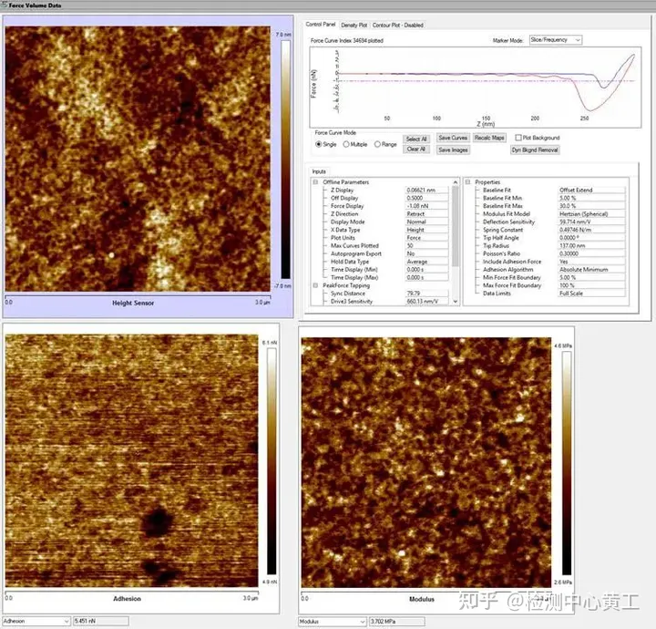 下图是样品在Force mapping模式下测得的形貌、模量、粘附性和其中一个点的力曲线。
