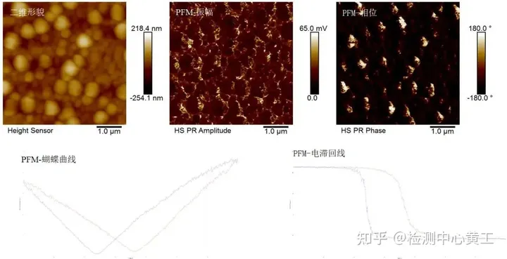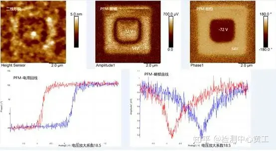 图7展示了PFM测量钛酸钡涂层的形貌、压电效应的振幅和相位分布,局部定点电压扫描获得了真实、准确的电滞回线和蝴蝶曲线。