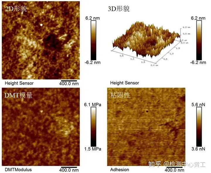 图10展示了样品表面形貌和对应的模量、粘附性的分布。